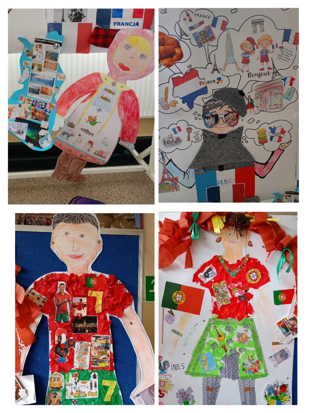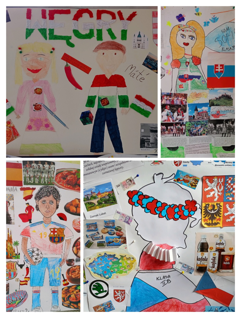To jednak nie wszystko – każda klasa przygotowała parę: chłopca i dziewczynkę w stroju wylosowanego kraju europejskiego. Dzięki temu stworzyliśmy barwną wystawę krajów Europy, która ozdobiła naszą szkołę.