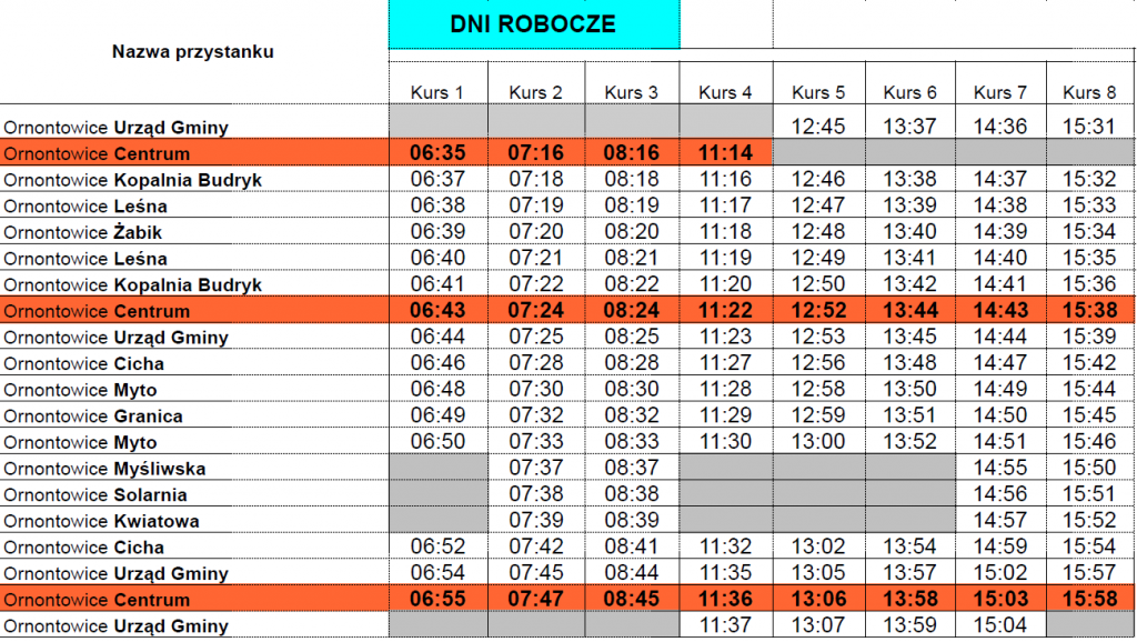 Wójt Gminy Ornontowice informuje, iż od 04.09.2023 r. zmianie ulega rozkład jazdy (Bus nr 1) ze względu na wprowadzenie nowego przystanku autobusowego o nazwie „Kwiatowa”.