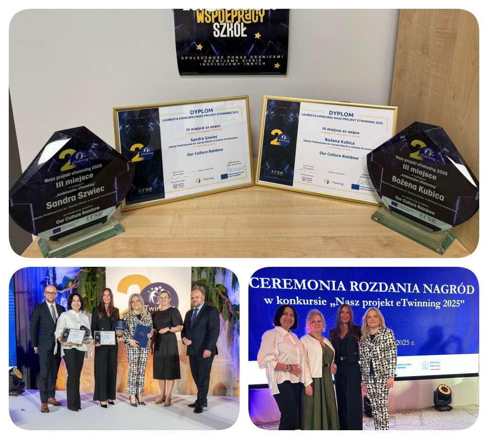 W piątek, 6 czerwca, w Warszawie odbyła się uroczysta ceremonia wręczenia nagród dla laureatów programu eTwinning. Z dumą informujemy, że projekt „Our Culture Rainbow” realizowany przez panie Bożenę Kubicę i Sandrę Szwiec oraz uczniów klasy 3A zdobył 3 miejsce w skali ogólnopolskiej w kategorii „Ambasador eTwinning”.
