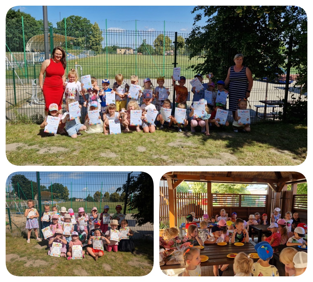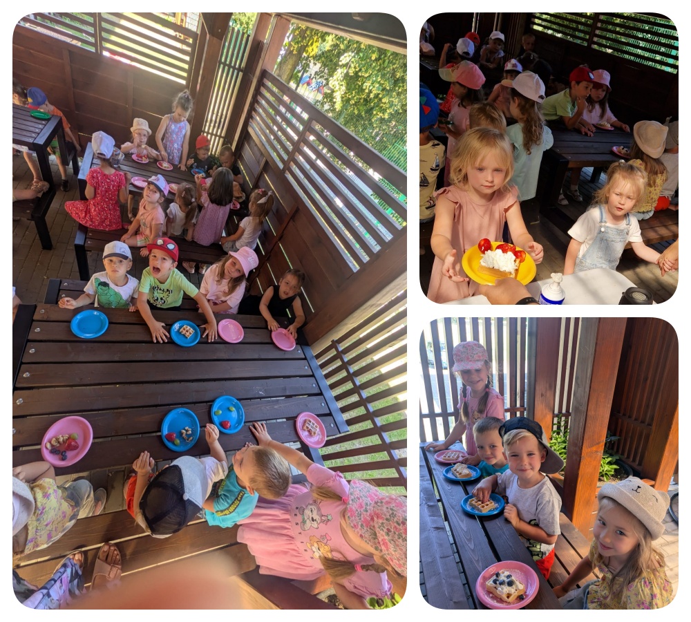 W środę 25.06.25 r. dzieci z grupy Jeżyki i Tygryski uroczyście pożegnały miniony rok szkolny w Ekopracowni pod chmurką. Wychowawczynie rozdały dzieciom dyplomy oraz drobne upominki. Nie zabrakło również słodkiego poczęstunku dla każdego dzielnego przedszkolaka- były pyszne gofry, bita śmietana oraz słodkie owoce. Dzieci bawiły się świetnie. Takiego wejścia w wakacyjny czas życzymy każdemu. Witajcie wakacje!