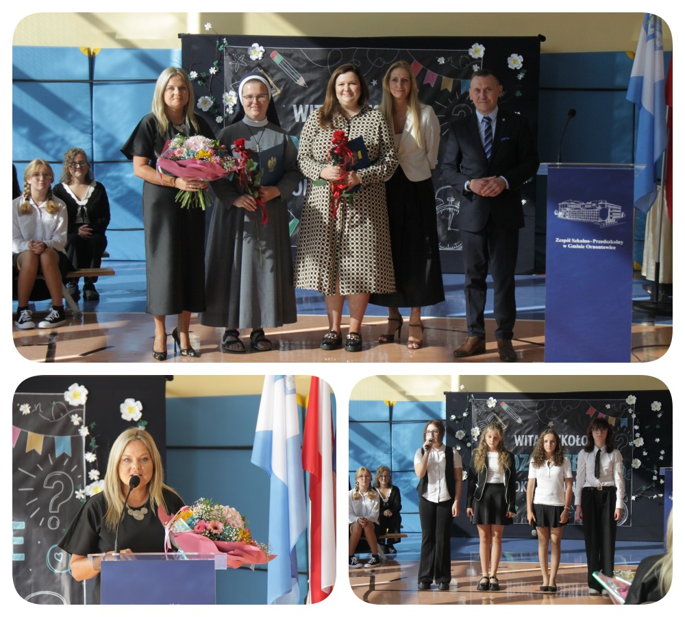 Następnie głos zabrała pani Dyrektor, składając całej społeczności szkolnej serdeczne życzenia owocnej pracy, radości z nauki i wytrwałości w dążeniu do celów. W swoim przemówieniu podkreśliła, że szkoła to nie tylko miejsce zdobywania wiedzy, ale również przestrzeń do budowania przyjaźni i rozwijania talentów.