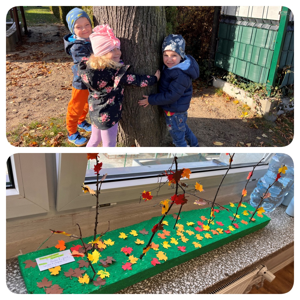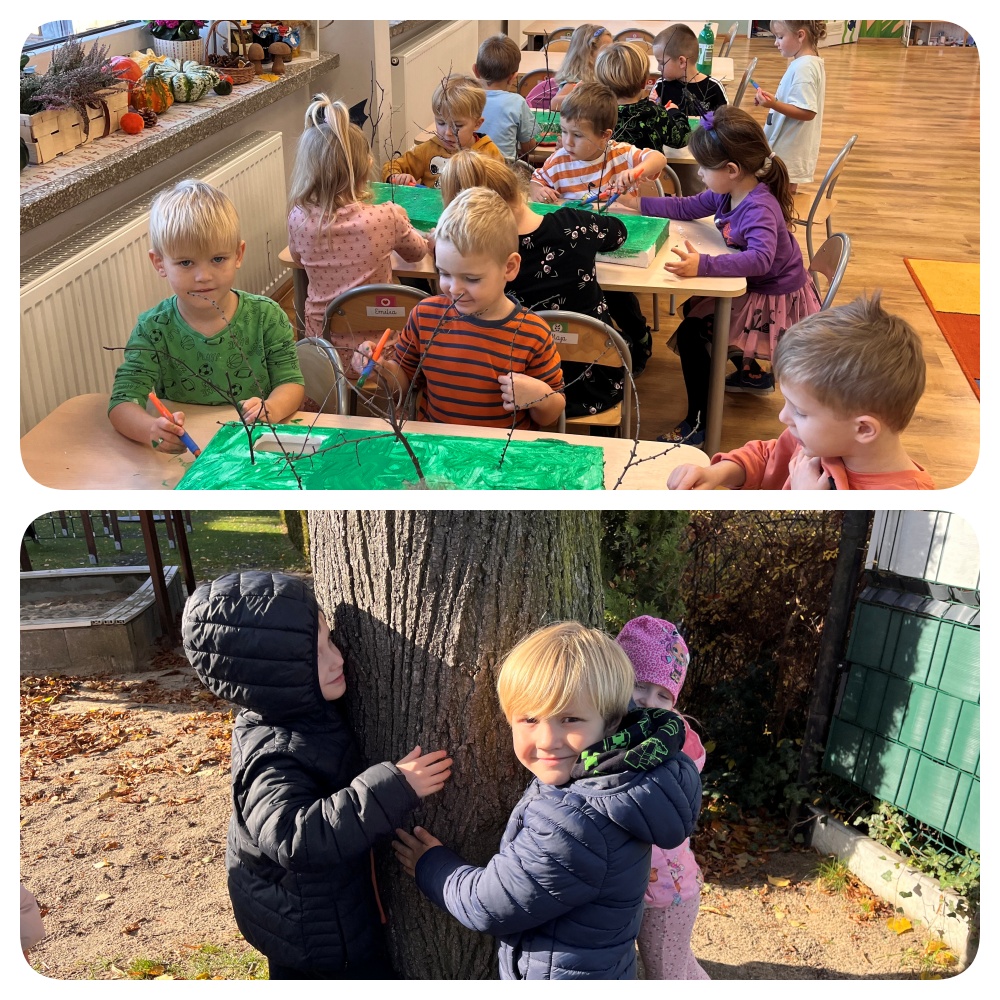 Z okazji Dnia Drzewa, grupa Jeżyki i Tygryski spędziły dzień w Parku rozmawiając na temat korzyści jakie czerpiemy z drzew. Był to idealny moment na przytulanie się do drzew i wsłuchanie się w szum spadających liści. Po powrocie do przedszkola, dzieci wykonały pracę plastyczną.