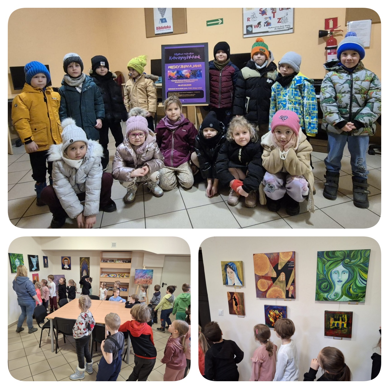 W ramach tygodniowego tematu „W pracowni artysty” nasze 6-latki wybrały się do Biblioteki Gminnej w Ornontowicach, gdzie miały niezwykłą okazję obejrzeć wystawę prac Katarzyny Walczak pt. „Między snem a jawą”.